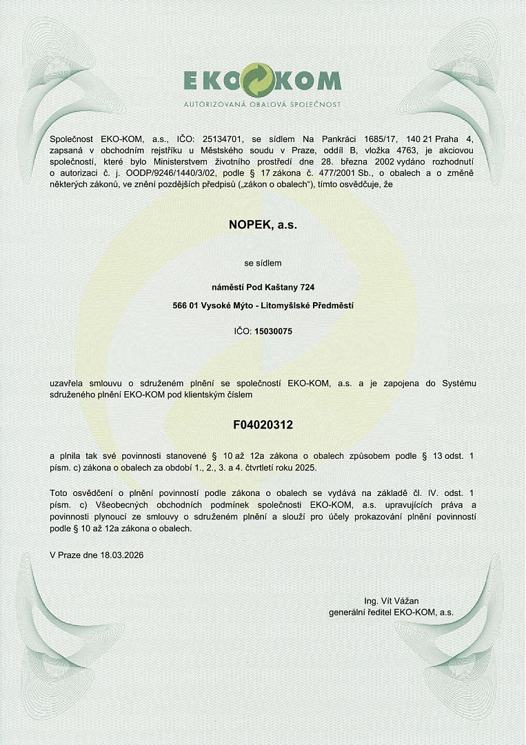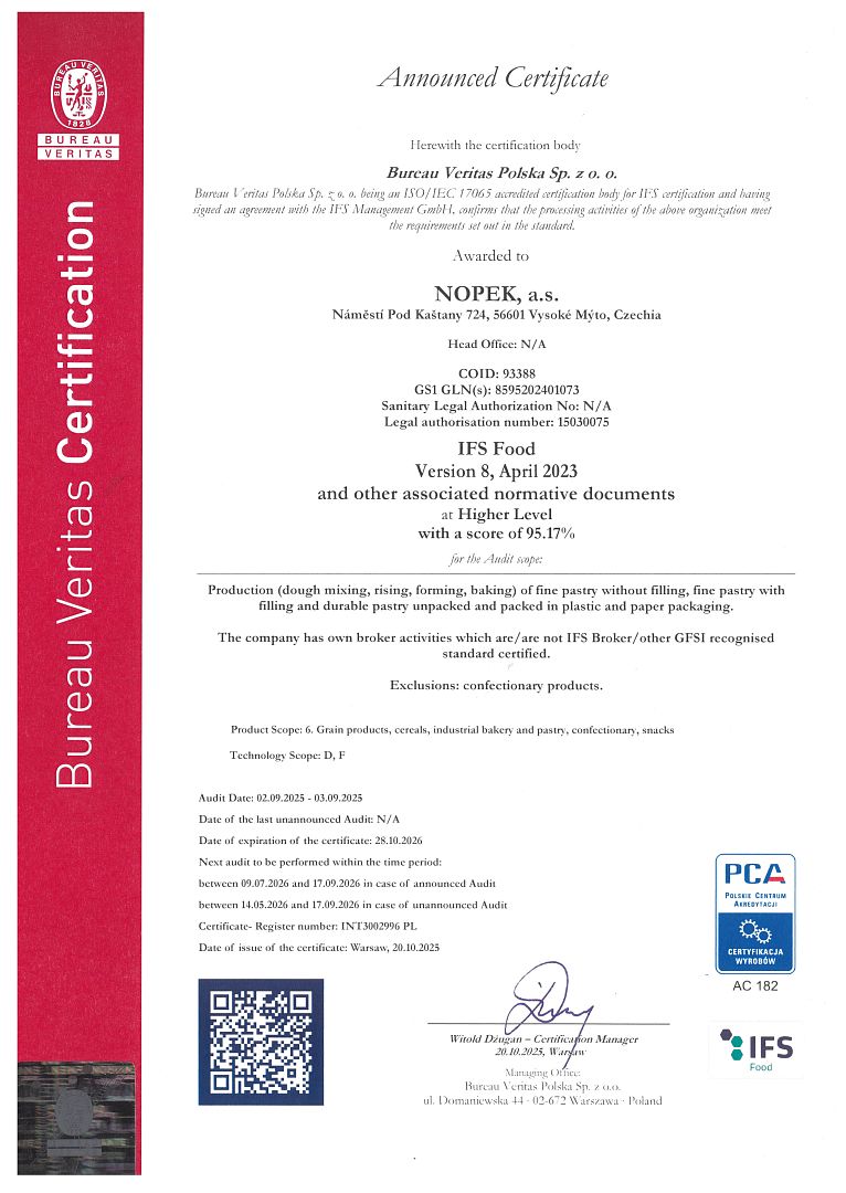 Společnost NOPEK, a.s. byla certifikována mezi prvními pekárnami u nás. Důkazem toho je získaný certifikát č. 00001 pro oblast certifikace HACCP. Vysoká úroveň kvality jednotlivých etap výroby je potvrzována každoročními audity vlastními i certifikační společností Bureau Veritas Certification.