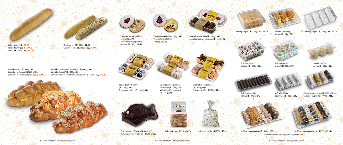 Zde naše aktuální nabídka vánočních produktů. Vše si můžete prohlédnout v níže uvedeném letáku (pod obrázkem najdete ještě odkaz přímo na leták ve větším rozlišení). Uvedené ceny platí ve všech našich podnikových prodejnách.